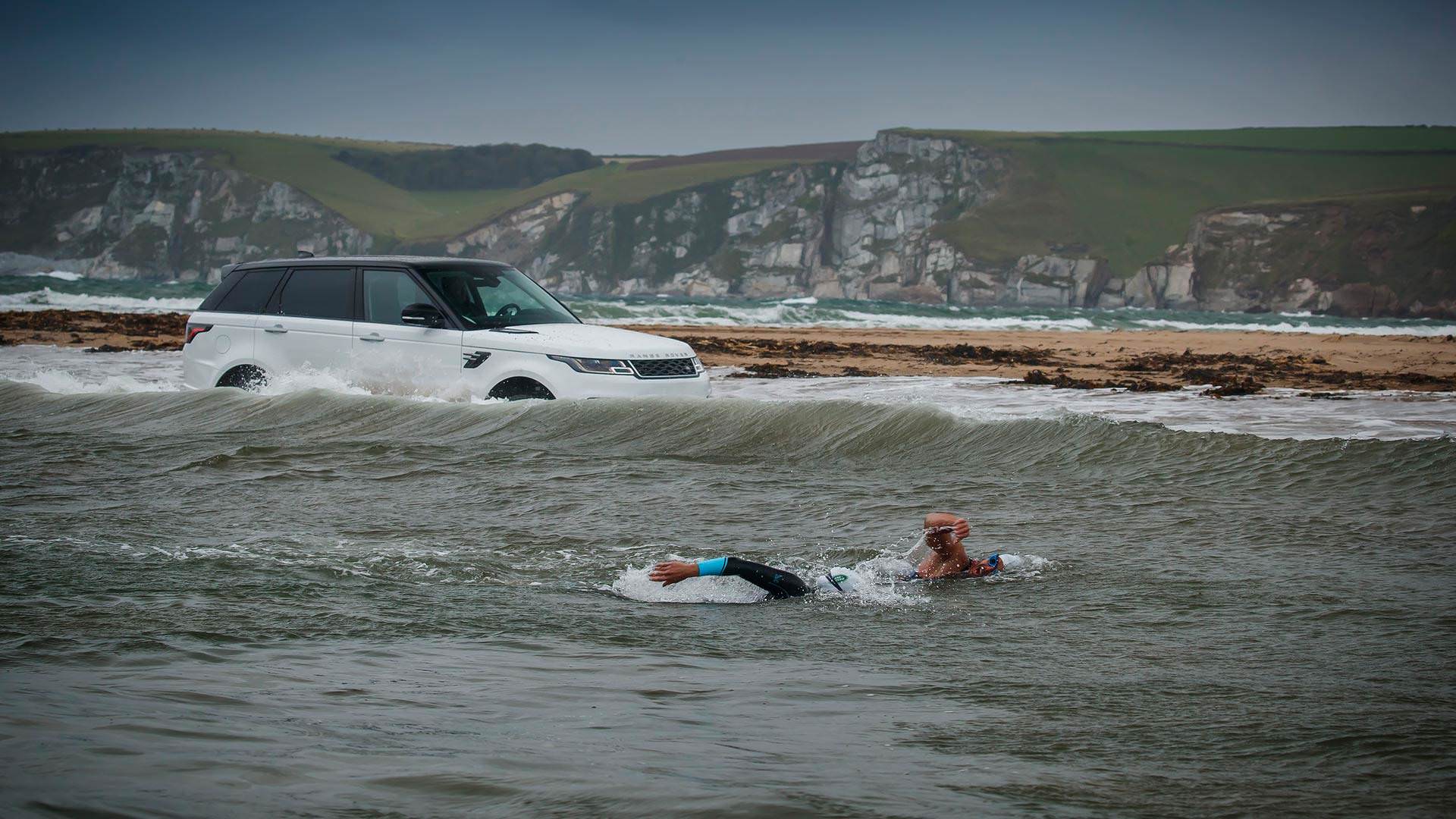 To keep things even, the Range Rover Sport PHEV had to travel 8.7 miles (14 kilometers starting inland and finishing at Burgh Island in the English Channel. Conversely, the swimmers only needed to cross 0.9 miles (1.5 km) through the water.