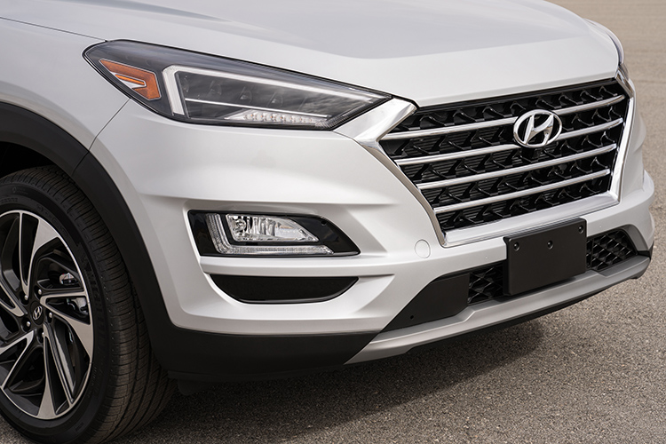 توسان ۲۰۱۹، در همهی نسخهها از گیربکس اتوماتیک ۶ سرعته استفاده میکند. جلوپنجره این مدل، دارای گوشههای تیزتری نسبت به قبل است تا ظاهری اسپرت و جوانپسند داشته باشد.این بخش، پهن و شبیه به محصولات لکسوس به نظر میرسد؛ ضمن اینکه بهجای سه ردیف خط کروم در مدل فعلی، دارای ۴ ردیف است. شاید مهمترین تغییر ظاهری توسان جدید نسبت به مدل ۲۰۱۷، استفاده از چراغهای اسپرت باشد که با نوار LED به شکل L همراه هالوژنهای جذاب ارائه میشود. روی سپر جلو، دارای پیچیدگی کمتری است و چندان لوکس به نظر نمیرسد.